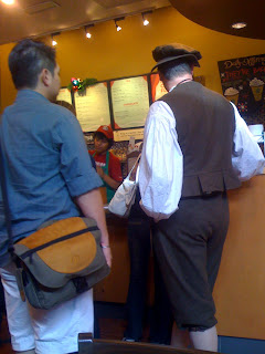 A guy dressed in 16th century european clothes in Starbucks, Sunway Pyramid.